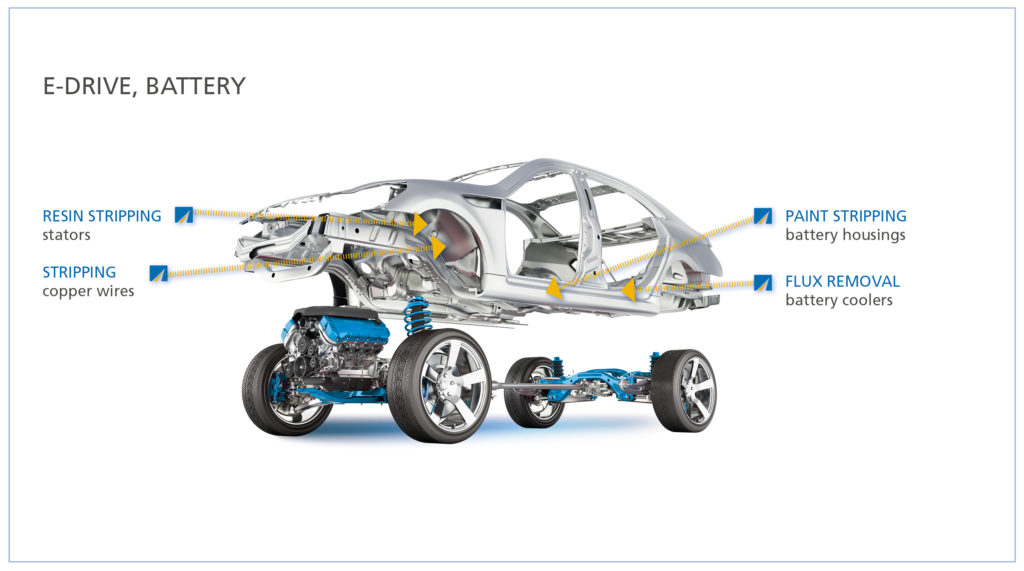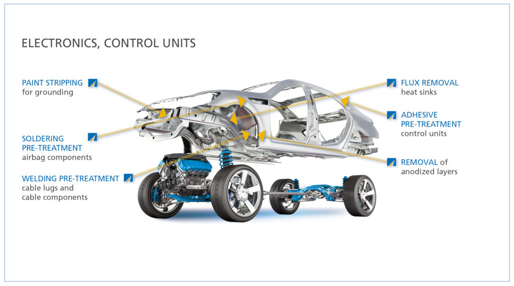Decapado de pintura para la toma de tierra, el pretratamiento adhesivo para unidades de control y el pretratamiento de soldadura para airbags o terminales de cable, la eliminación de fundentes y la eliminación de capas anodizadas.