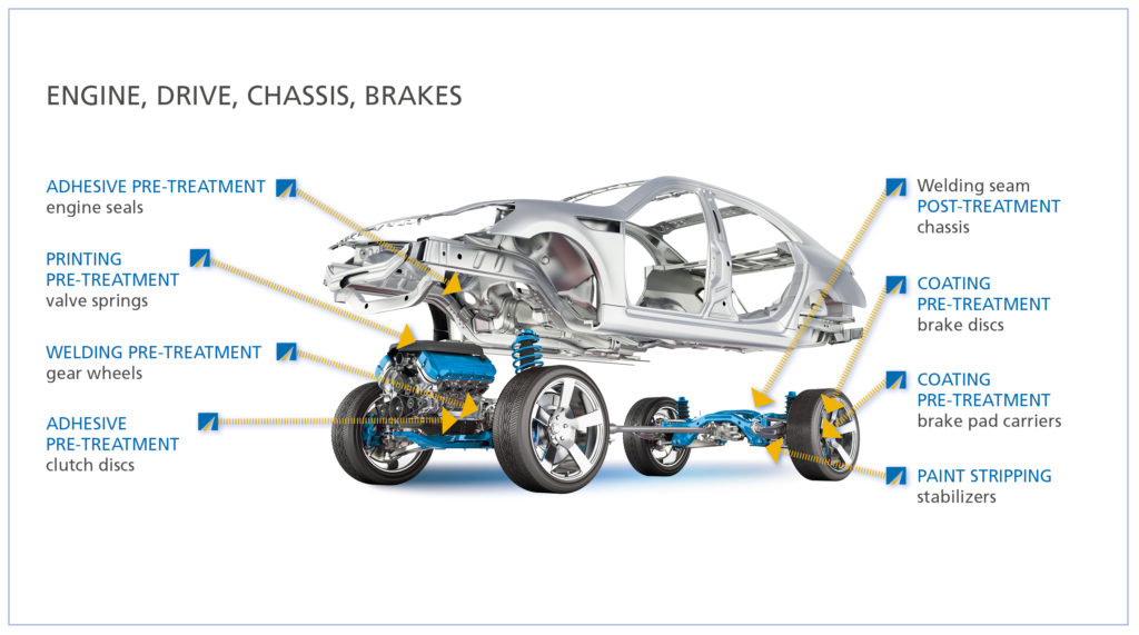 Pretratamiento adhesivo de los sellos del motor o los discos de embrague, el pretratamiento de soldadura de las ruedas dentadas o el postratamiento del chasis, la eliminación de la pintura de los estabilizadores, así como el pretratamiento del revestimiento de los discos de freno o de los portapastillas de freno.