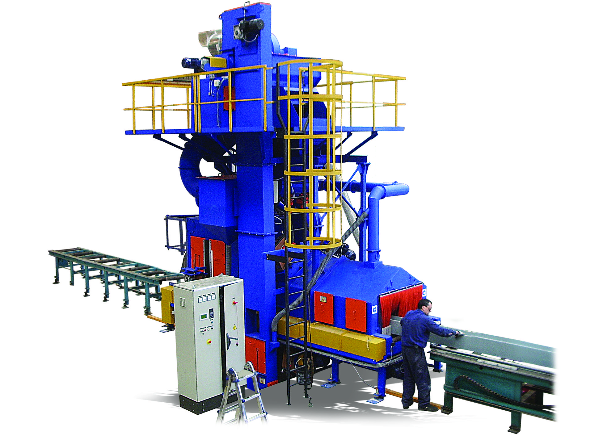 Líneas continuas con rodillos o carros para piezas largas o voluminosas (perfiles, calderería, chapas). Rendimiento alto y automatización de transporte dentro de la línea de granallado