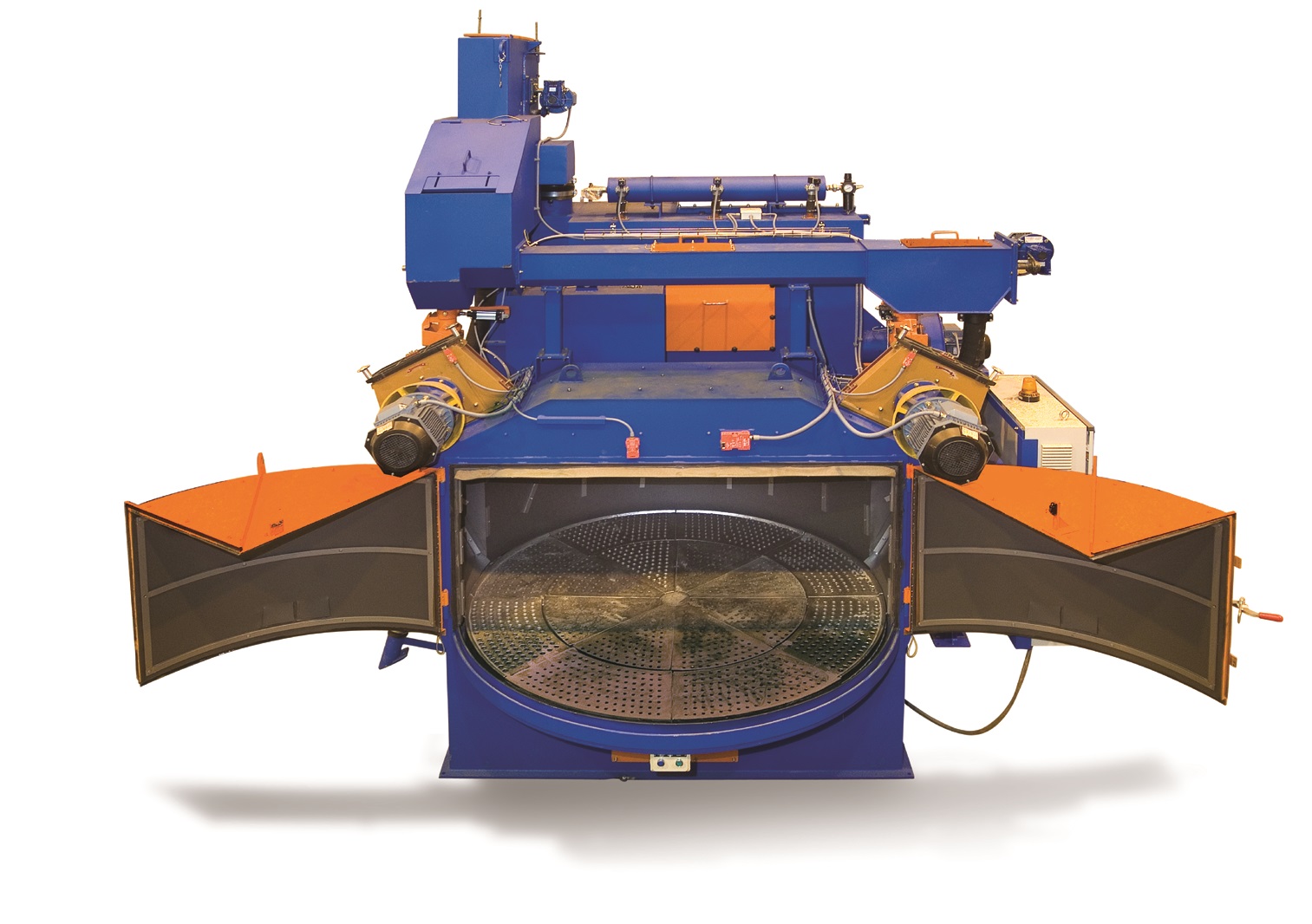 Las granalladoras de plato, también conocidas como granalladoras de mesa, son equipos en los que las piezas se colocan horizontalmente sobre un plato giratorio. Durante el proceso, la superficie expuesta recibe el impacto de la granalla de forma uniforme, mientras que la cara en contacto con el plato permanece sin tratar.
