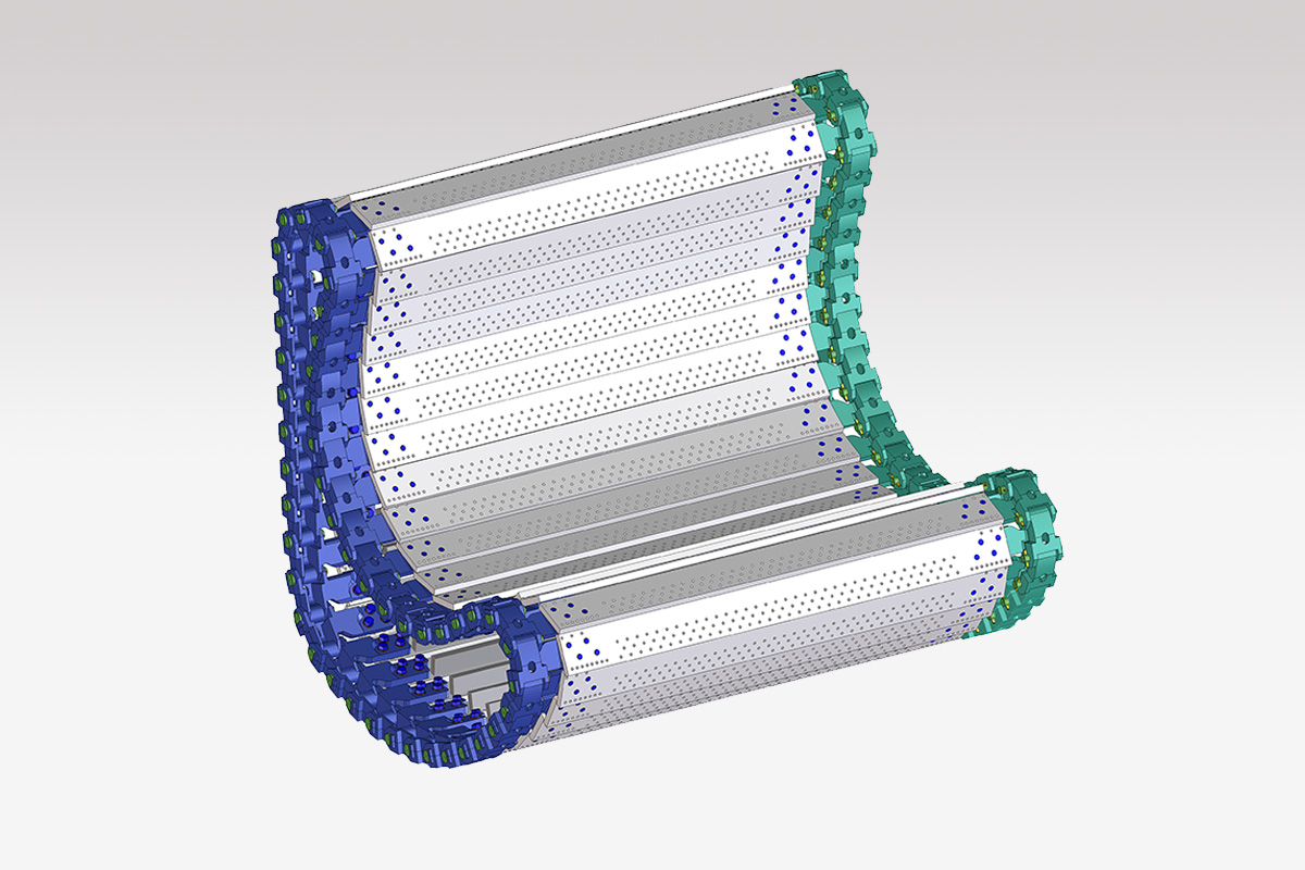 Las granalladoras de tablilla metálica —también conocidas como de tapiz metálico, de persiana o Tumblast— utilizan una cámara de granallado formada por tablillas metálicas articuladas que hacen girar las piezas durante el proceso.