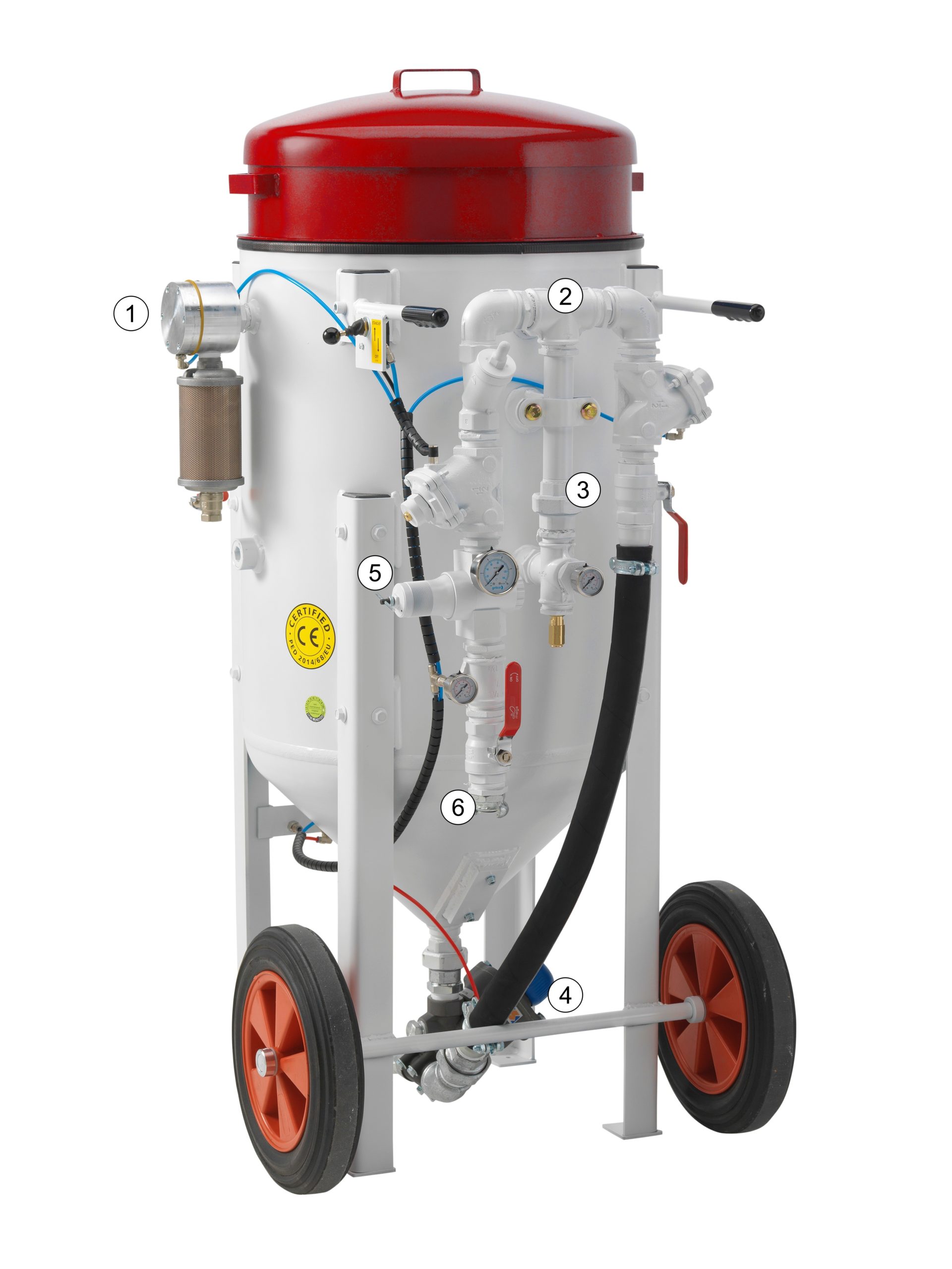 (5) La válvula reguladora (opcional) permite ajustar la presión de chorro adecuada. Esto es importante no sólo para obtener los resultados de chorreado requeridos (limpieza, rugosidad, velocidad) sino también para el reciclaje (y la vida útil) de los abrasivos reutilizables.