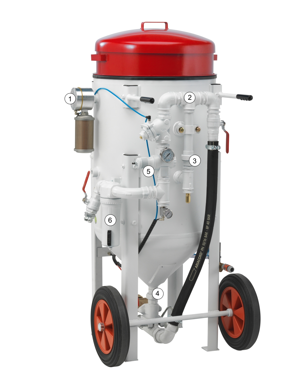 (5) La válvula reguladora (opcional) permite ajustar la presión de chorro adecuada. Esto es importante no sólo para obtener los resultados de chorreado requeridos (limpieza, rugosidad, velocidad) sino también para el reciclaje (y la vida útil) de los abrasivos reutilizables.