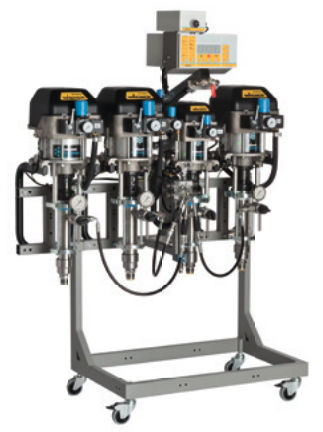 Sistema de mezcla y dosificación controlado electrónicamente para aplicaciones multicolores, que permite procesar hasta 25 colores y 4 componentes simultáneamente.