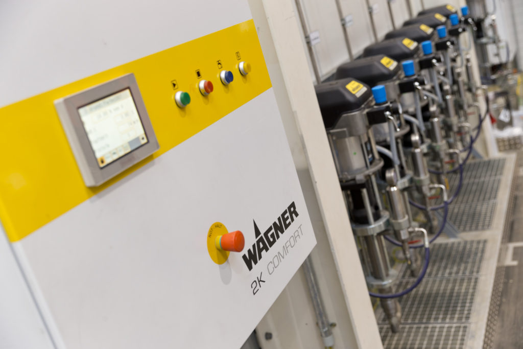 Gracias a las bombas de pistón de alta presión WAGNER PROTEC, incluso con materiales muy viscosos y altos espesores, el caudal constante y la alimentación automática logran una relación de mezcla exacta.