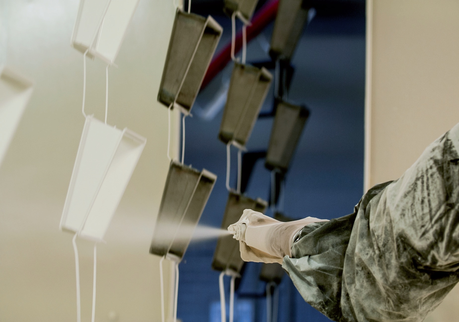 Para el pintado de piezas sobre transportadores aéreos, desde estructuras de acero variadas (como vigas, perfiles, etc) hasta marcos de ventana.