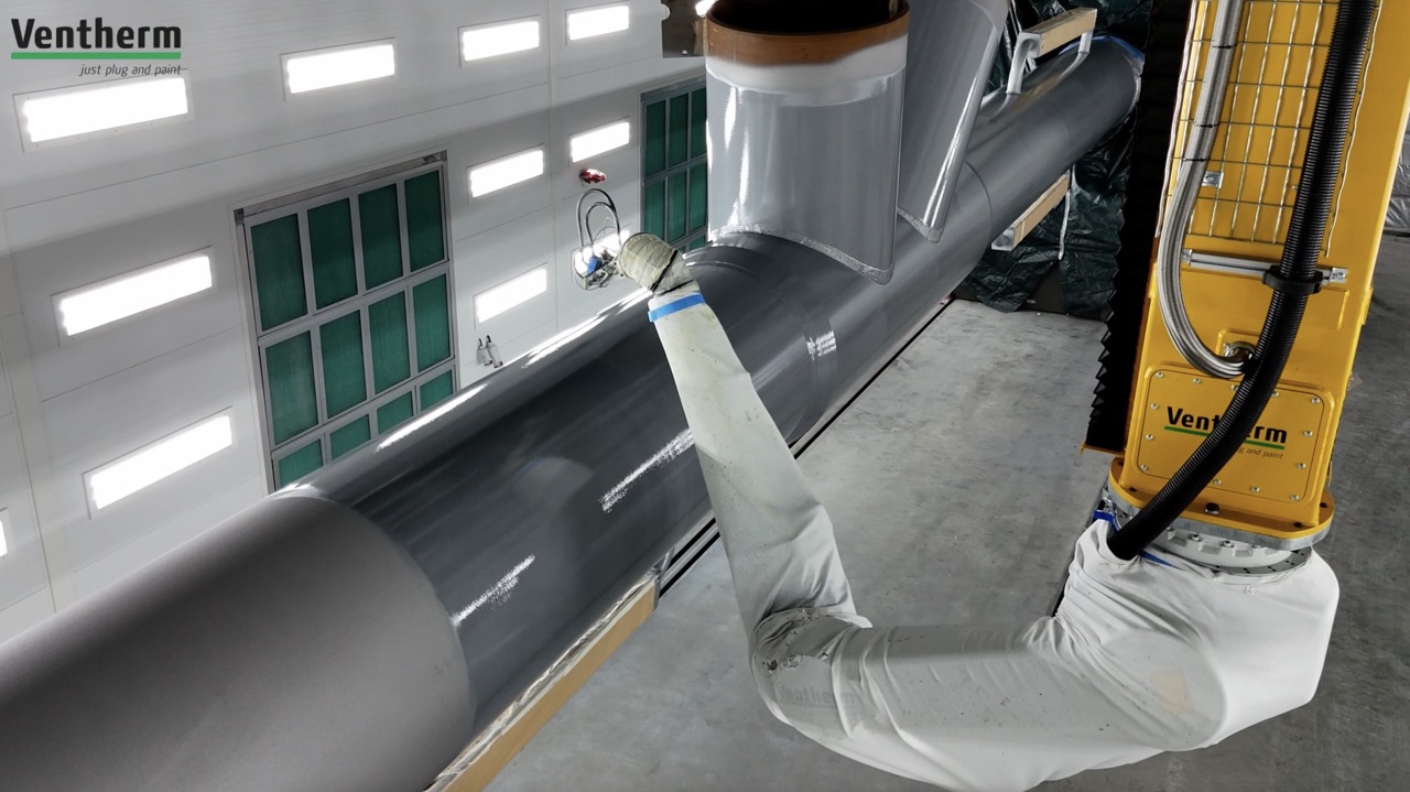 La solución robótica de Ventherm A/S funciona escaneando la pieza sin pintar en 3D y, a partir del escaneo, el software genera automáticamente un programa que planifica las rutas de pintura más óptimas y optimiza el consumo de pintura.