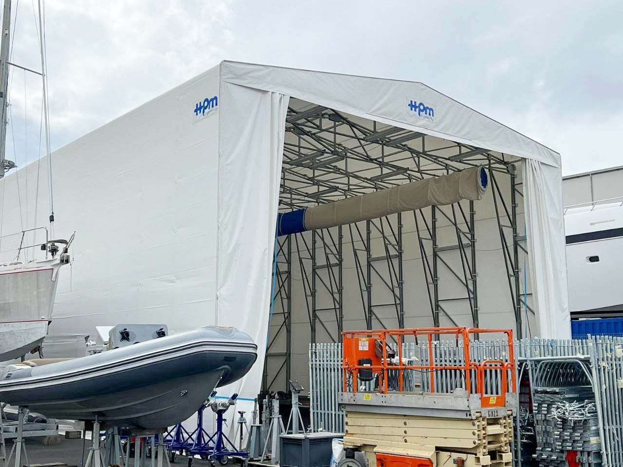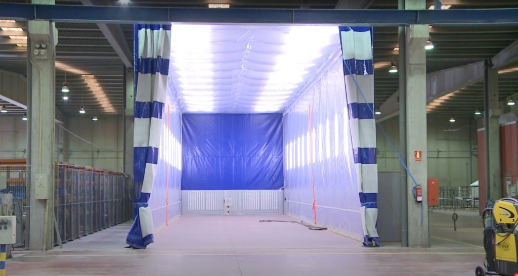 - Una estructura retráctil de arcos de acero galvanizado, montada sobre ruedas y revestida con lona de PVC ignífuga.